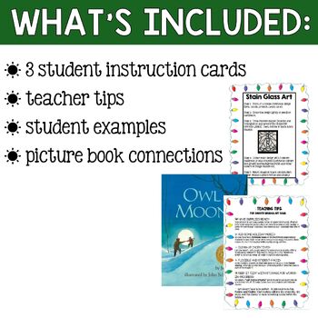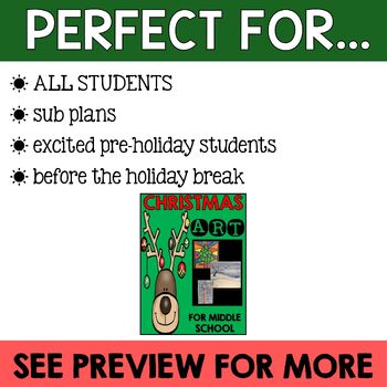 Middle School Christmas Art is a great way to keep students working until the holidays. This product includes 3 low prep Art activities that have been classroom tested and approved. Easy to follow art lessons to keep students engaged but not overly worked leading up to the winter break. An instruction sheet and student sample are included for each activity.
